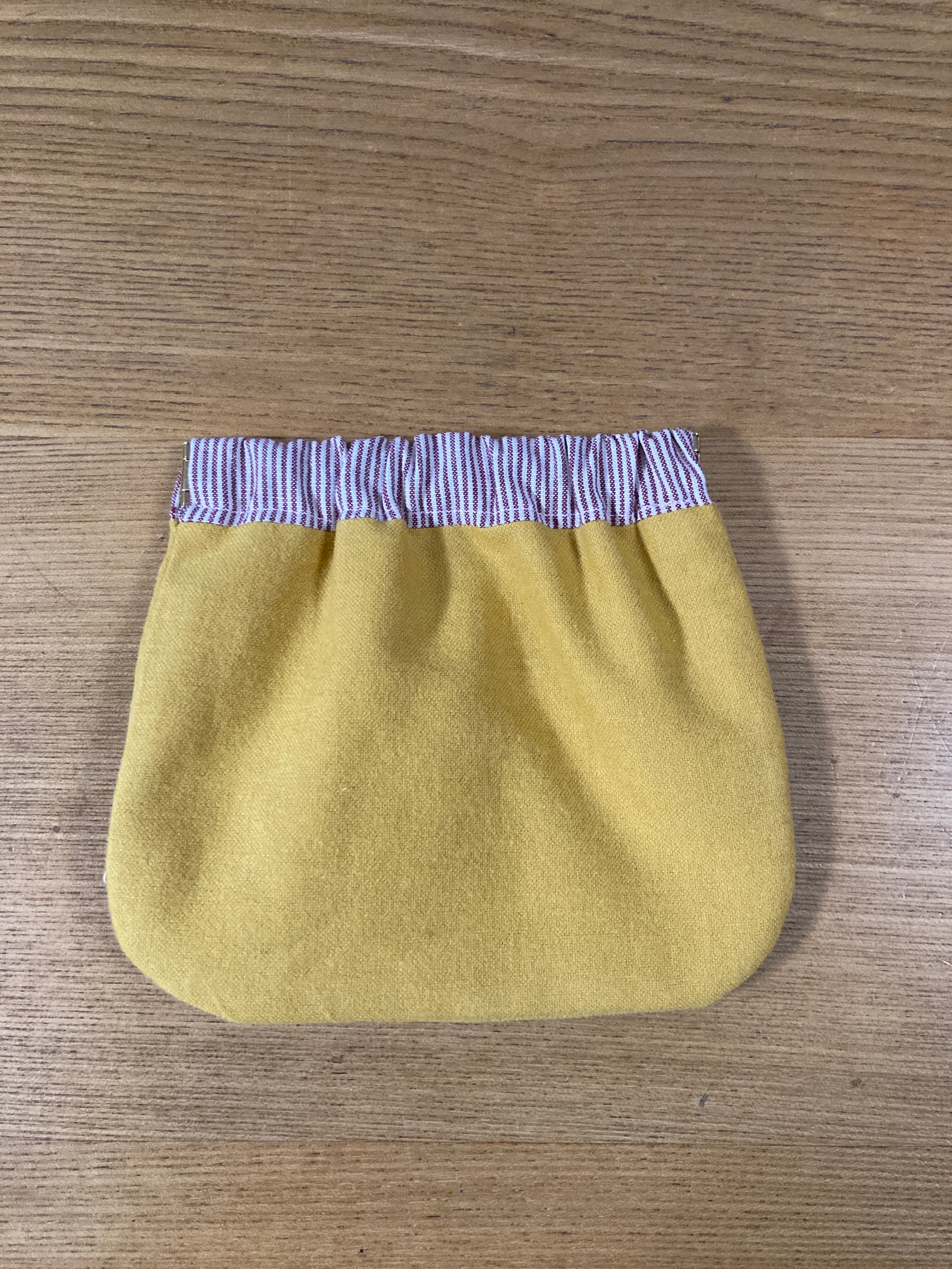 落ち着いた黄色の触り心地の良い綿の布にバネ口と内布は赤のストライプの組み合わせのバネポーチになります