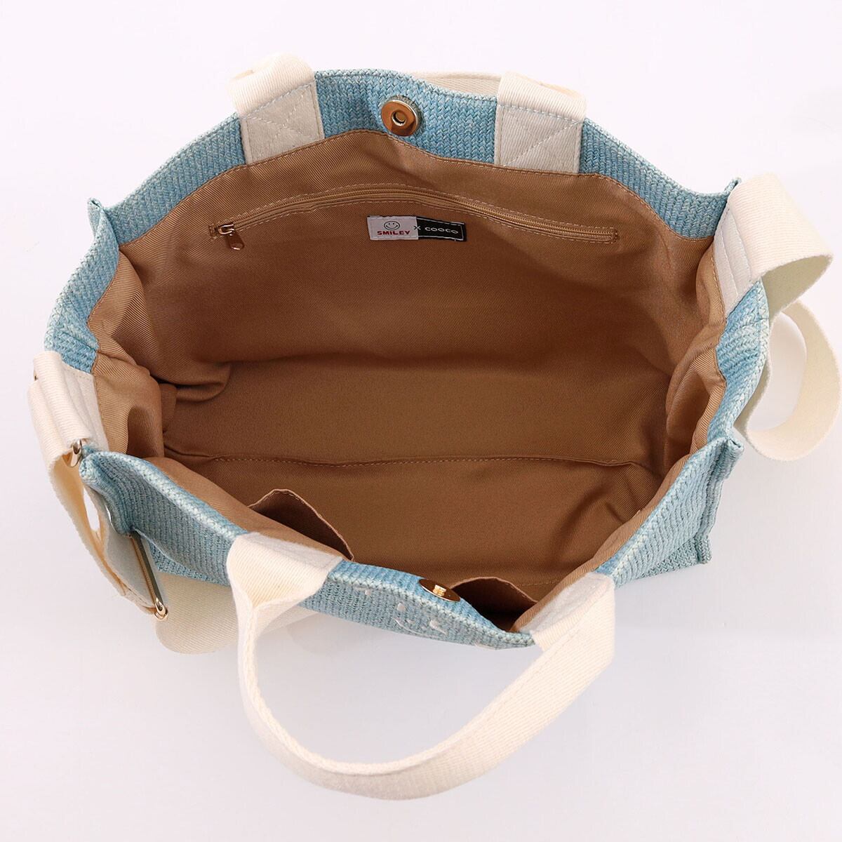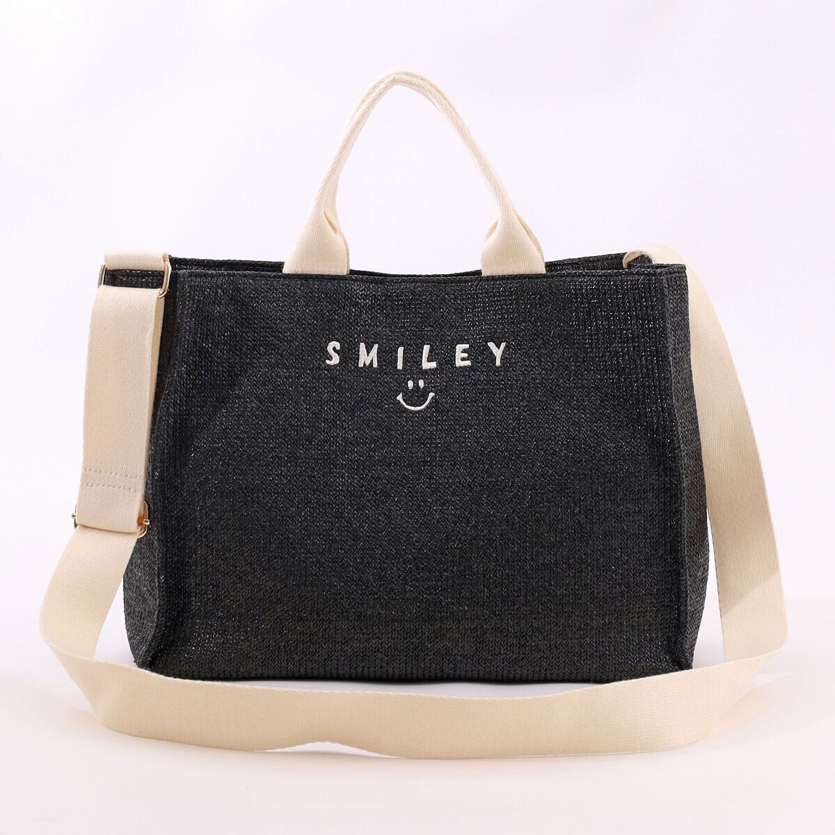 正面にSMILEY刺繍、背側にフェイクレザーのポケット部分にスマイルフェイスを型押しした2Wayトートバッグ。